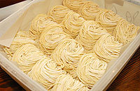 | 大成機械工業の製麺機を導入して自家製麺を行っている。店内の一角に製麺室を設置。窓ガラスを通して製麺している様子がよく見える。演出効果も満点だ。 |